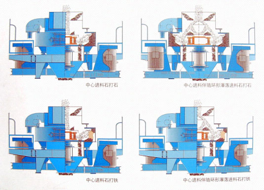 Com base no princípio avançado de britagem seletiva e britagem por clivagem, o equipamento aplica diretamente energia cinética suficiente ao material e converte essa energia cinética na energia necessária para esmagar o material através do impacto. O material quebra principalmente ao longo da sua textura natural e plano de clivagem, formando um formato de partícula de alta qualidade, ao mesmo tempo que reduz o autoconsumo do equipamento. O equipamento pode realizar a conversão dos dois modos de trabalho "pedra batendo em pedra" e "pedra batendo em ferro". Durante o processo de britagem, o material cai verticalmente do topo da máquina para o impulsor rotativo de alta velocidade e é sujeito a uma forte força centrífuga e colide com outra parte do material dispersa em torno do impulsor em forma de guarda-chuva a alta velocidade , conseguindo assim a britagem preliminar. Posteriormente, estes materiais formam um vórtice entre o impulsor e a carcaça e sofrem múltiplas colisões e fricções para serem ainda mais refinados. Por fim, o material é descarregado verticalmente pela parte inferior do equipamento, formando uma circulação múltipla em circuito fechado. Através da triagem pelo equipamento de peneiramento, pode-se obter o tamanho de partícula do produto acabado que cumpre os requisitos.