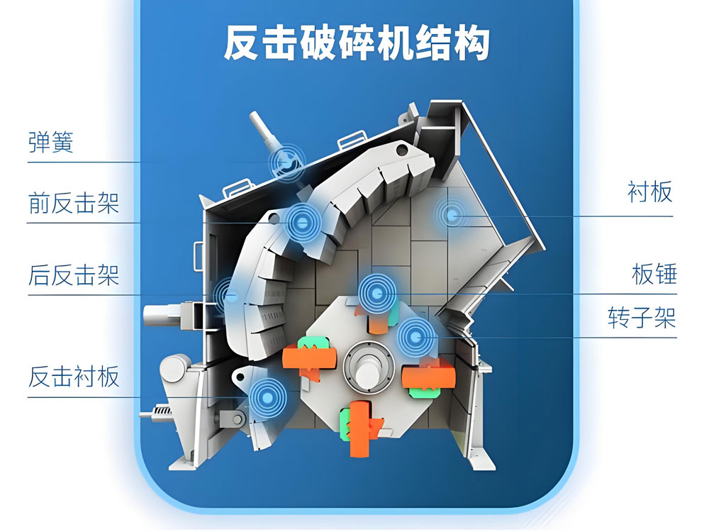 O princípio de funcionamento do britador de impacto é usar energia de impacto para triturar materiais. Durante o processo de trabalho, o motor aciona o rotor para girar em alta velocidade. Após o material entrar na área de ação do martelo de placa, ele colide com o martelo de placa no rotor e é triturado. O material triturado é jogado na placa de impacto, é impactado e triturado novamente, e então ricocheteia da placa de impacto para a área de ação do martelo de placa, e o processo acima é repetido. Ao ajustar a folga entre a placa de impacto e o martelo de placa, o tamanho do tamanho da partícula de saída pode ser controlado. Este método de trituração "pedra-batendo-ferro" não só tem uma grande taxa de trituração, mas também tem baixo consumo de energia unitária, o que pode atender aos requisitos do processo de "mais trituração e menos moagem".